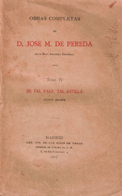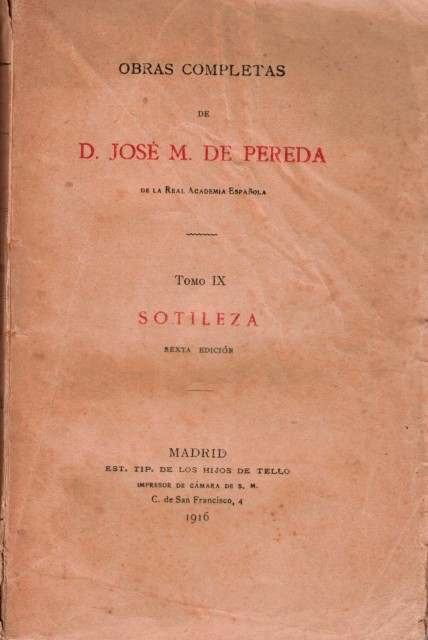 Obras Completas de José M. de Pereda. Tomo IX. Sexta Edición. Madrid 1916. Est. Tip. de los Hijos de Tello. Rústica. 568 pp. 18x12. Lomo algo rozado, no afecta al texto.