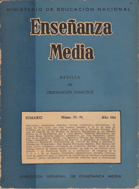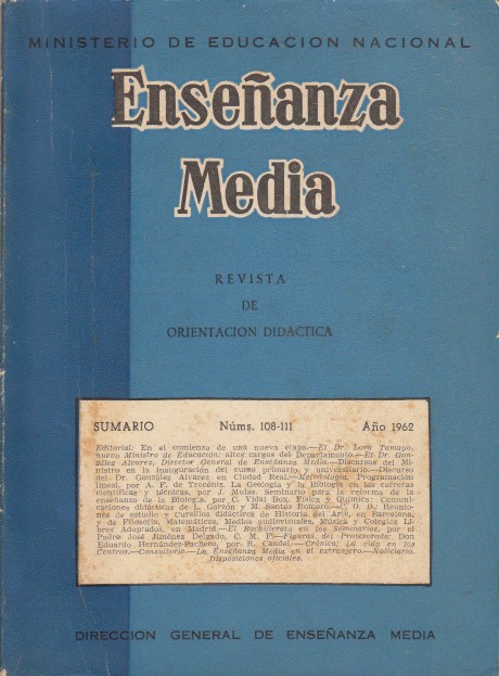 Madrid 1962. Ministerio de Educación Nacional-Dirección General de Enseñanza Media. Enseñanza Media, Revista de Orientación Didáctica, nº 108-111. Octubre-Noviembre 1962. 374 pp. 21x16. Rústica. Cantos algo rozados. Manchas de humedad no afecta texto. Deplegable.