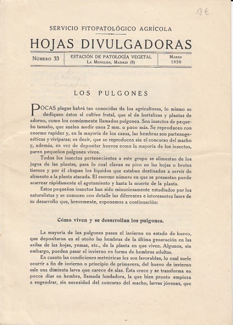 Madrid 1930. Servicio Patológico Agrícola. Hojas Divulgadoras, Estación de Patología Vegetal nº 33. Marzo 1930. 8 pp. 24x17. Sin cubiertas. Grapado. Ilustrado.