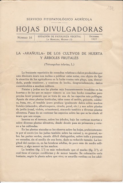 Madrid 1927. Servicio Patológico Agrícola. Hojas Divulgadoras, Estación de Patología Vegetal nº 16. Diciembre 1927. 6 pp. 24x17. Sin cubiertas. Ilustrado.