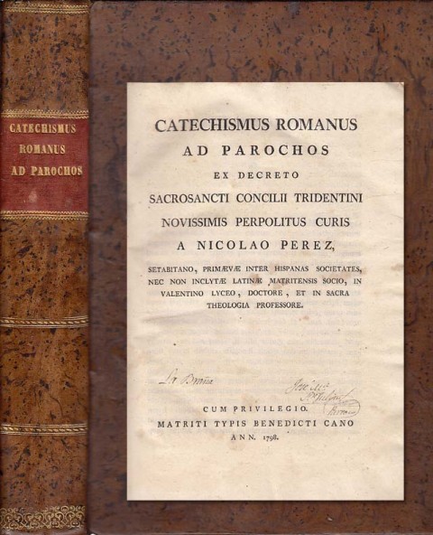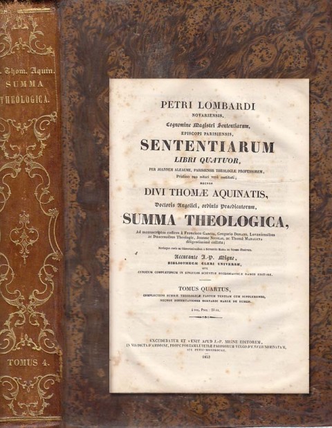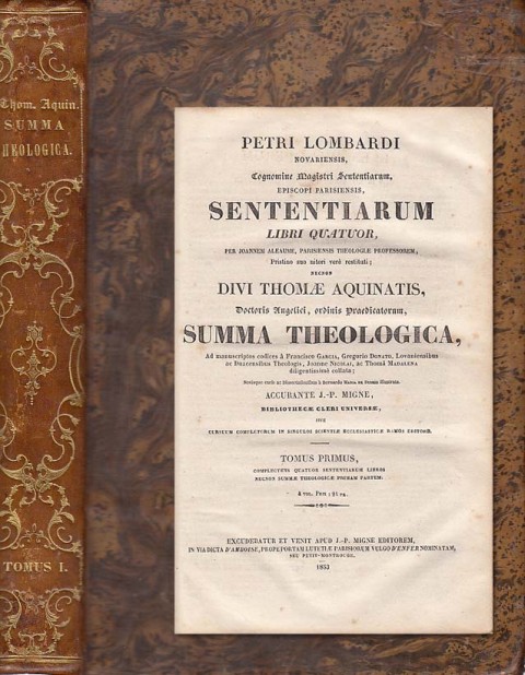París 1853. J. P. Migne Editorem. Patrologiae Cursus Completus sive Bibliotheca Universalis, Integra, Uniformis, Commoda, Oedonomica, Omnium SS. Patrum, Doctorum Scriptorumque Ecclesiasticorum. Patrologiae Tomus Petri Lombardi Necnon Divi Thomae Aquinatis Tomus Primus. 1346 pp. 28x19. Piel. Cantos coloreados. Texto en latín.