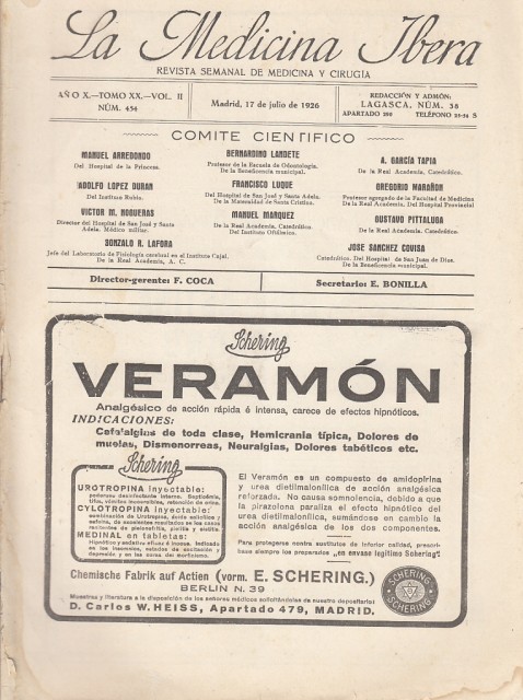 La Medicina Ibera. Revista semanal de Medicina y Cirugía. Madrid 1931. Año XV. Tomo XXV. Vol. I. Núm. 692. 64 pp. Fotografías en blanco y negro. Incluye interesante publicidad de medicamentos. 27 x 20. Rústica. Pequeñas manchas en la cubierta delantera, no afecta al texto.
